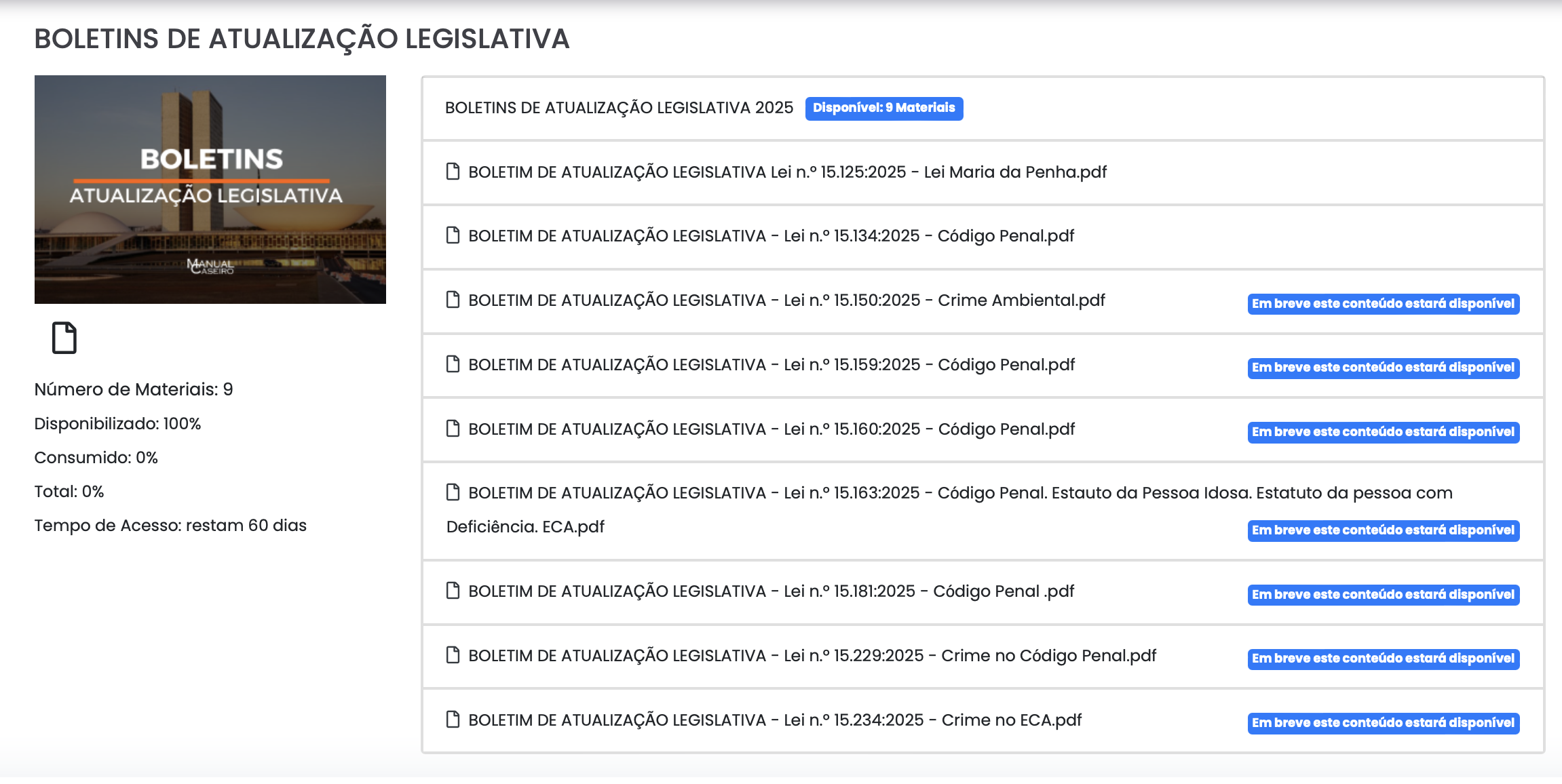 E é por isso que o Manual Caseiro criou o curso Boletim de Atualização Legislativa — o material que organiza, comenta e explica cada uma das leis que transformaram a área penal em 2025.