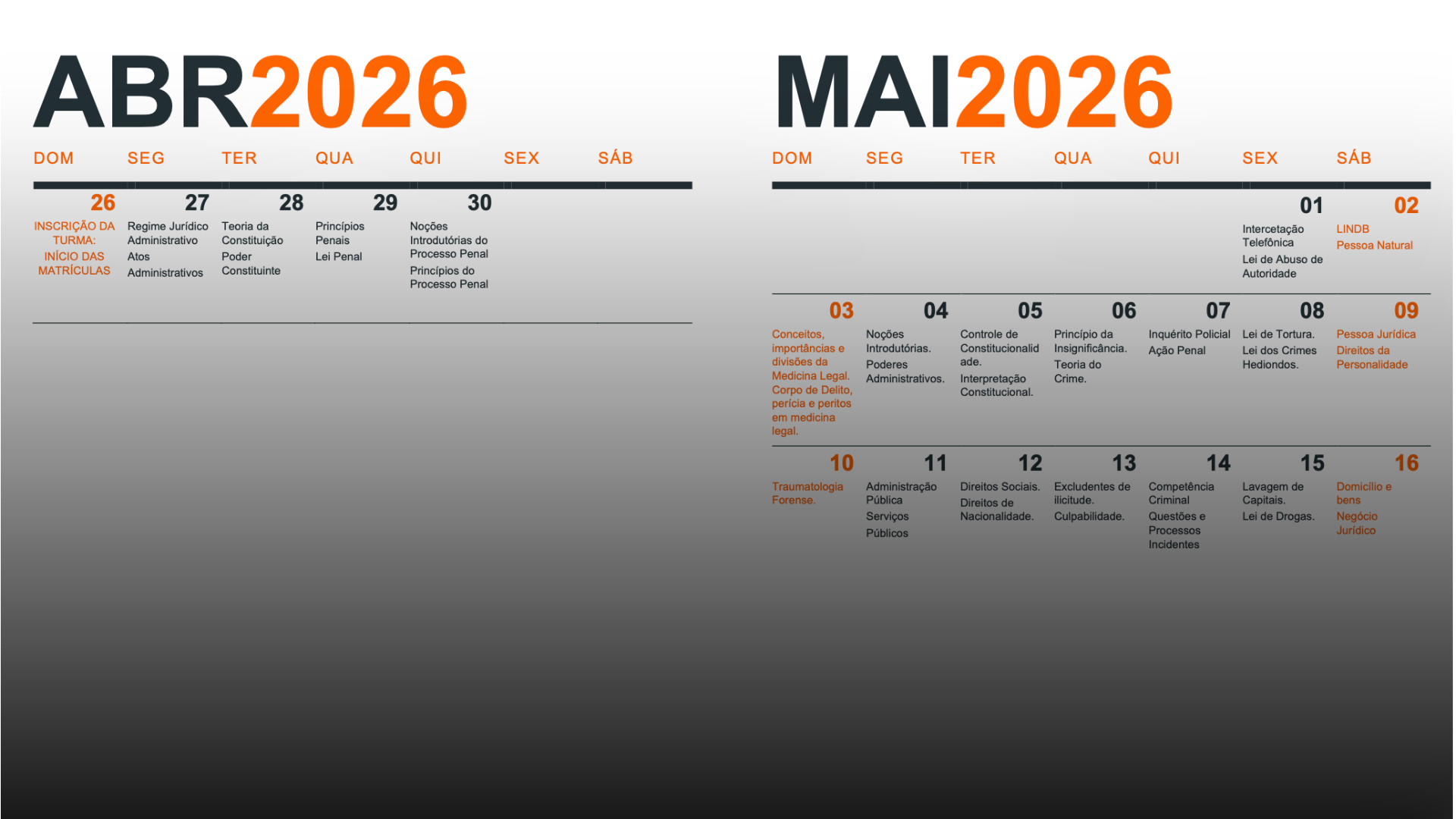 1) Direito Constitucional; 2) Direito Administrativo; 3) Direito Penal; 4) Processo Penal; 5) Legislação Penal Especial; 6) Criminologia; 7) Direito Civil; 8) Direito Tributário; 9) Direito Ambiental; 10) Direito Empresarial; 11) Medicina Legal.